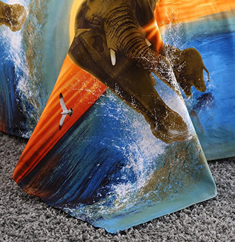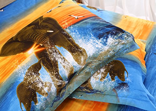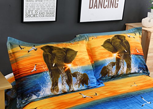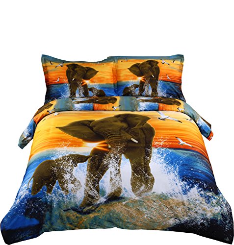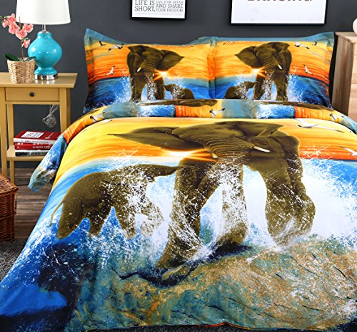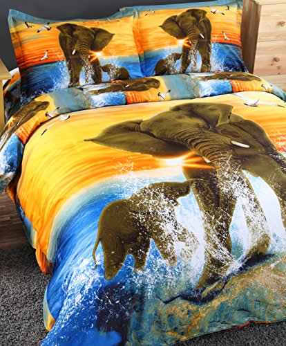 Beddinginn 4 Pieces 100% Cotton Bedding Sets Elephant Playing Water Print Duvet Cover Set(Queen)