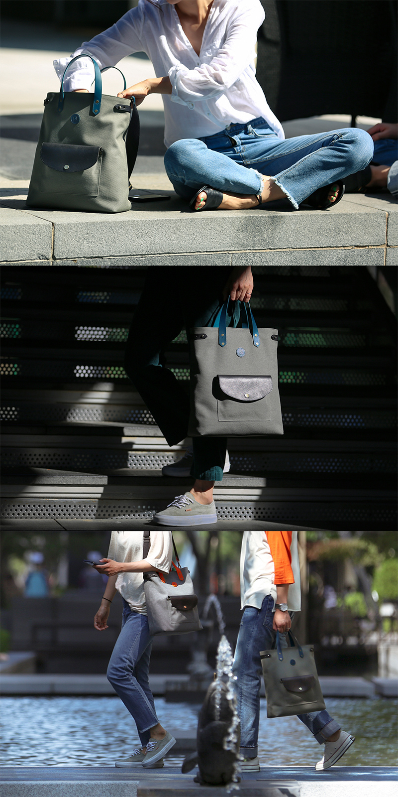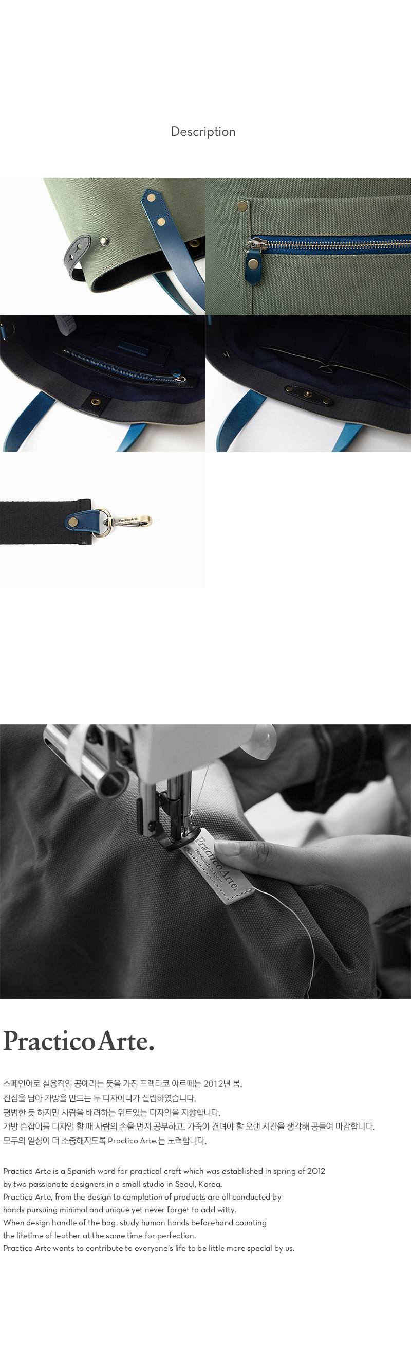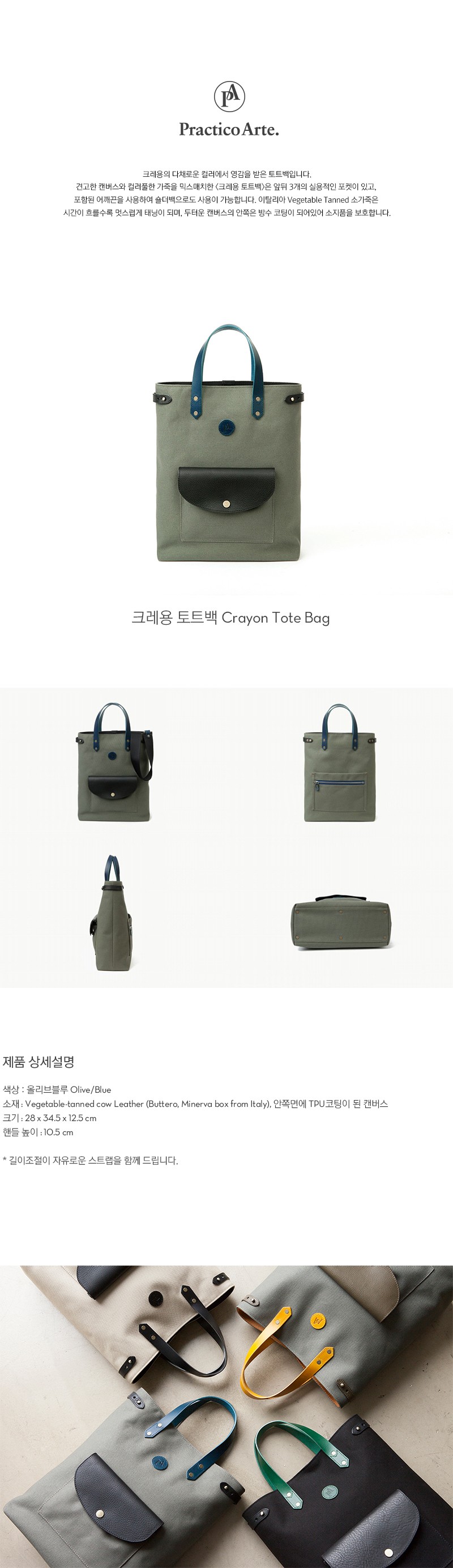견고한 캔버스와 선명한 블루컬러 가죽을 믹스매치한 <크레용 토트백>은 앞뒤 3개의 실용적인 포켓이 있고, 조절가능한 어깨끈을 사용하여 숄더백으로도 사용이 가능합니다.