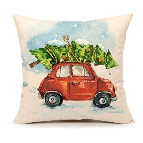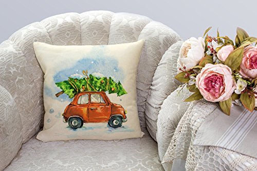 Christmas Tree and Red Car Throw Pillow Cover Home Decorative Cushion Case 18 x 18 Inch Cotton Linen for Sofa(Cartoony)