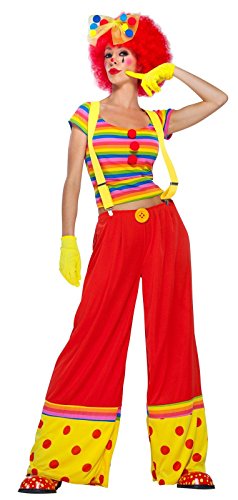 -. Feature : This sassy clown costume for women includes a striped top, wide leg pants, suspenders and bow headpiece.