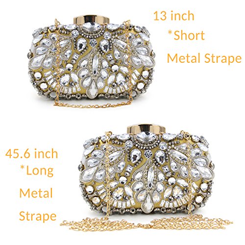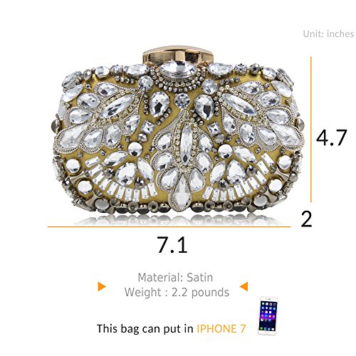 -. Feature : -STYLE-: Beaded Bridal Clutch Bag With Metal Shoulder Chain / -MATERIALl-: Clear Plastic decorations, Metal piecess, Black Beaded / CLOSURE: Hasp style Closure With Metal Shaped. Back side is Pure Color Satin. / DIMENSION: 20.5*12*5.5 CM. It fits in IPhone6s, Cash, Lipstick, Small Sosmetics, Keys. / OCCASION: Wedding, Party, Cocktail Ceremony, Daily, Dating