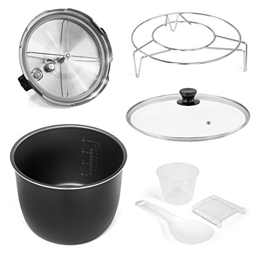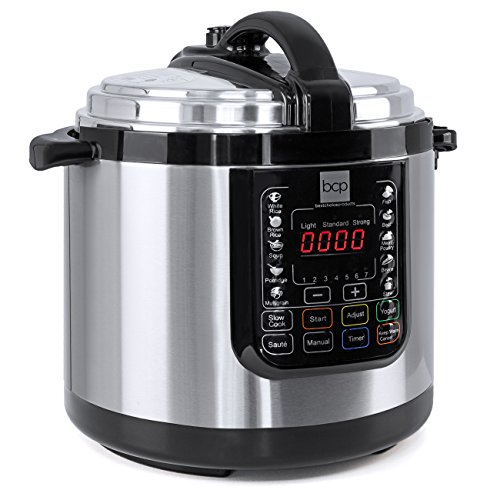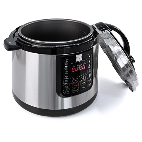 Studio : Best Choice Products Publisher : Best Choice Products Product Description Why cook under pressure when you can cook with it? With 10 pre-set programs, you can quickly and easily prepare: beef, poultry, fish, beans, rice, soup, and more! This pressure cooker is designed with durable stainless steel, an integrated LED display, and an internal microprocessor to keep track of time, heat, and pressure, ensuring consistent meals. Reduce time and effort-never flavor-with the 6-Liter Stainless-Steel Pressure Cooker by Best Choice Products! SPECIFICATIONS: Overall Dimensions: 13"(Dia) x 13.5"(H); Inner Basket Dimensions: 9.5"(Dia) x 6.5"(H); Weight: 11 lbs.; Cooking Capacity: 6L; Color: Silver; Material: Stainless-Steel; Includes: (1) pressure cooker, (1) rack, (1) glass lid, (1) measuring cup, (1) spatula, and (1) power cord; Power: 1000W; Voltage: 120V / 60Hz; No assembly required; 0