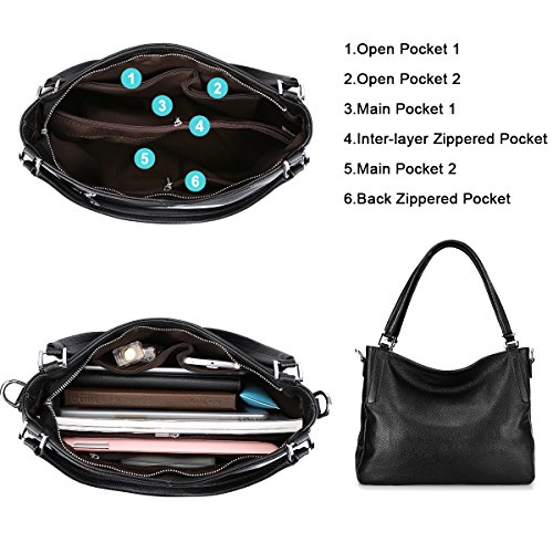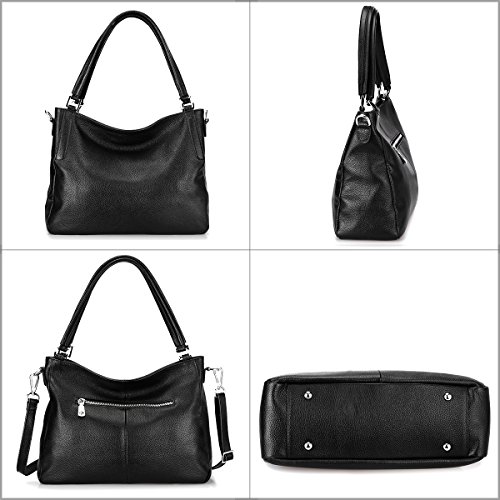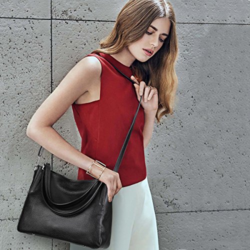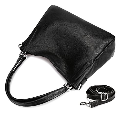-. Feature : Durable Materials: Made of high-quality and top grain genuine leather with durable silver hardware & sturdy fabric lining. The leather feels soft and the appearance is gorgeous. The bag reflects elegant urban style. / Dimension and Weight (L*H*W): 10.4*9.2*5.2 inches/ 26*23*13 cm, Net Weight: 1.48lb/ 0.67kg, Handle height: 7.2 inches/ 18 cm, Shoulder drop: adjustable 11.6-24 inches/ 29-60 cm. / Large Capacity: 1 main zippered pockets; 1 zippered back pocket; 2 interior zippered pockets; 3 interior open pockets; Roomy enough to store Ipad Mini, perfume, lipstick, wallet and other essential items. / Stylish Design: Top zippered closure ensures security. Comes with a detachable and adjustable cross-body strap which is made of genuine leather and synthetic fiber. Metal rivet protect on bottom. / Versatile: The bag can be used as a handbag, a shoulder bag and a cross-body bag. Perfect to match with many outfits. Great to carry in dating, office, shopping, traveling, gathering, or any other daily occasions.