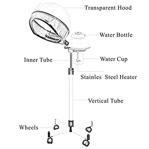Hindom New Adjustable Height PROFESSIONAL Hair Steamer PERFECT FOR Conditioning, Priming, and Dying Hair, this professional hair steamer is a great addition to any salon or even home use.? ?SUPER easy to use! ?Double Steam Modules (low and high steam setting). ?60 minute timer. ?Swivel Casters for easy maneuverability. ?Professional, durable hood with air escape openings. ?Swivel Hood ?110v Input Product Specifications: 100% Brand New. Material: Plastic, Metal Color: White Input Voltage: 110v Plug: US standard Plug Adjustable Height 120 to 146cm/46.8 to 57.4inch Feature: Professional, Height Adjustable, Swivel Hood Package Content: 1 x Adjustable Hair Steamer Attention: These units will not work in countries with voltage ranges of 220V to 240V! 0 |