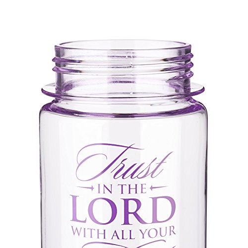 The "Trust in the Lord" Purple Plastic Water Bottle has a 28 ounce capacity, a webbed loop for carrying and a plastic push-button, flip-top lid with a locking mechanism - simply rotate the ring to lock / unlock. The entire lid can be removed for washing. The bottle design features stylized text from Proverbs 3:5-6 in contrasting deep purple.Feature