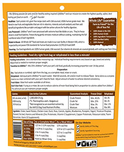 -. Binding : Misc. -. Brand : Whole Life Pet Products -. EAN : 0895777000274 -. Feature : Whole Muscle Protein with no ground bone creates amazing taste and texture / Human Grade mixer or complete meal made in-house in small fresh batches daily / Live active probiotic cultures from yogurt plus pumpkin to support healthy digestion / Rich in Antioxidants from raw fruits and vegetables and Omega's from Chia and Flaxseed / Every batch tested and verified safe -. Label : Whole Life Pet Products -. Manufacturer : Whole Life Pet Products -. Model : FD274 -. MPN : FD274 -. NumberOfItems : 1 -. PackageQuantity : 1 -. PartNumber : FD274 -. ProductGroup : Boost -. ProductTypeName : PET_SUPPLIES -. Publisher : Whole Life Pet Products -. Size : 16 oz -. Studio : Whole Life Pet Products -. Title : Whole Life Pet LifeBites Duck Recipe Freeze Dried Food for Dogs, 16 oz -. UPC : 895777000274