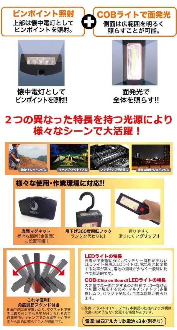 | 仕様 | 底部マグネット付 吊下げ360度回転フック付 角度調節スタンド付 電源:単四アルカリ乾電池×3本(別売り) 連続点灯時間:約3時間 明るさ最大:200ルーメン |