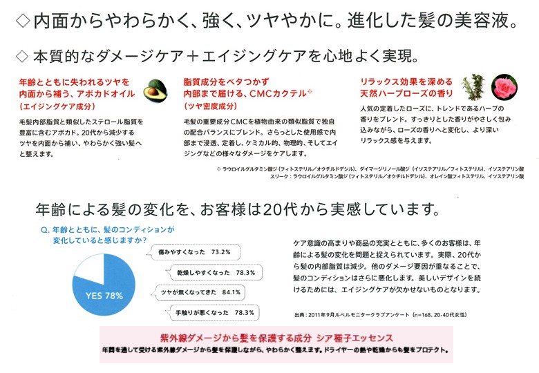 紫外線ダメージ保護成分(シア種子エッセンス)季節的なダメージによるパサつきやごわつきの原因から髪を保護します。