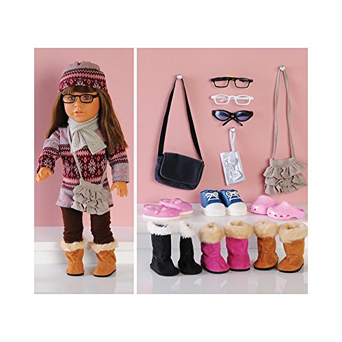 Embellish any outfit with this 15 pc. set of accessories for your 18" doll. 3 pairs of shoes, 3 pairs of boots, 3 pairs of eyeglasses with cases, and 3 purses will give children lots of options when dressing their doll. (Doll and clothes not included.)Feature