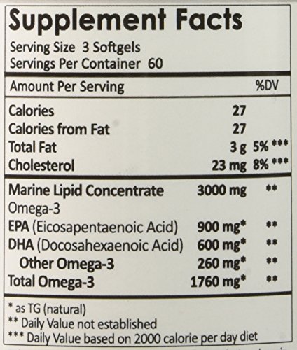 Nutrition facts: Calories 27"Calories from Fat 27"Total Fat 3 g 5%" Cholesterol 23 mg 8%""Marine Lipid Concentrate 3000 mg *"Omega-3"EPA (Eicosapentaenoic Acid) 935 mg *"DHA (Docosahexaenoic Acid) 620 mg *"Other Omega-3 315 mg *"Total Omega-3 1870 mg