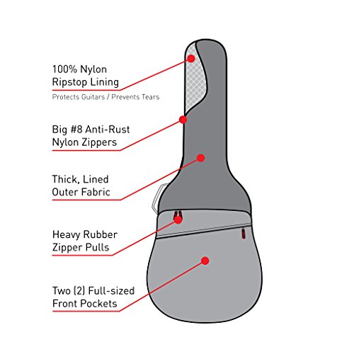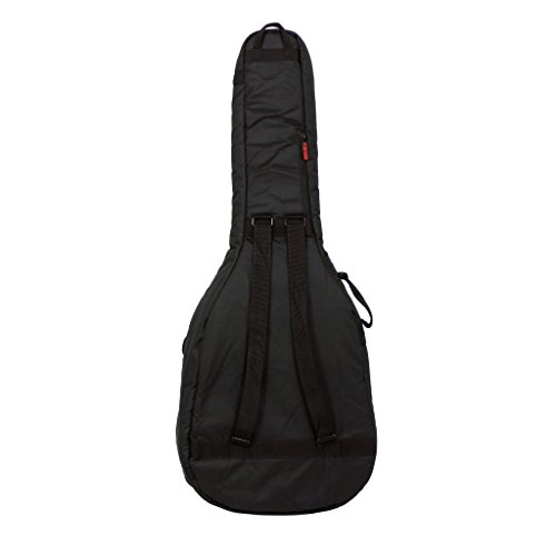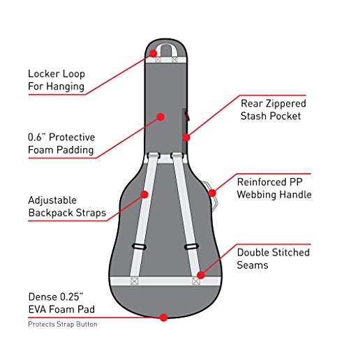 - Feature : This is a guitar case for a standard size acoustic guitar case. Designed with the minimalist in mind, this black guitar case is constructed of durable polyester. It's reliable, versatile, and anything but plain. / With a reinforced carry handle, locker loop, backpack straps and rust-proof zippers, sewn with heavy duty polyester luggage thread, this case is guaranteed not to fail by our 1 year warranty. / Padded with over .5" of plush polyurethane foam combined with and ultra-durable .25" EVA foam pad at the base of the bag for added protection where it's most needed. / Large 17"x17"x1" front pocket to fit sheet music, folders, straps, and small binders. Small hidden pocket for easy access to picks and other accessories. / With interior dimensions of 42"x17.5"x5", this case is designed to fit full-sized acoustic guitars, including: Alvarez AD90; Epiphone Hummingbird, PR-150, DR-100; Fender FA-100, Squier Acoustic; Gibson J-45; Gretsch G5022; Guild D-55; Ibanez V70, AEG10; Martin D-18; Ovation Celebrity; Paul Reed Smith SE; Rogue RA-090, RA-100D; Seagull Original S6, Coastline; Takamine S35; Taylor 210, Washburn D10, Yamaha F335, FG700. Will not fit multiple neck guitars and atypical body styles such as Flying Vs.