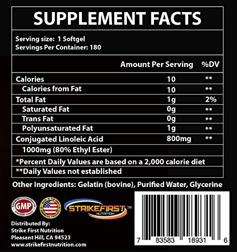 Studio : Strike First Nutrition Publisher : Strike First Nutrition Binding : Health and Beauty Product Description CLA is an essential fatty acid that can not be made by the body and is important for good health. We get small amounts of it from our diet, but good sources are limited. Research has shown CLA to be beneficial in supporting a healthy body weight and promote lean muscle mass, with even greater improvements in individuals who combine exercise with regular CLA intake.* -PubMed Says Concludes: Given at a dose of 3.2 g/d, CLA produces a modest loss in body fat in humans. https://www.ncbi.nlm.nih.gov/pubmed/17490954 0