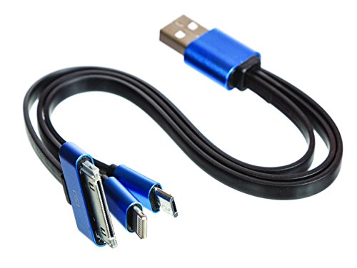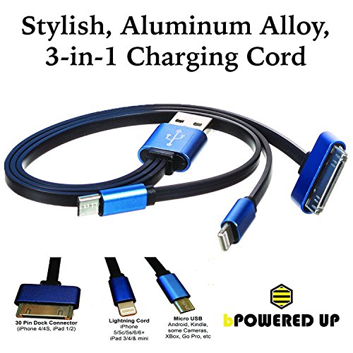 TWO-PACK-Upgraded Aluminum 3-in-1 Cords. Lighting cord for charging iPhone 5 iPhone 6 and iPad mini. Micro cord for charging Android cell phones. 30 pin charging cord for iPhone 4 and iPads.