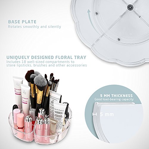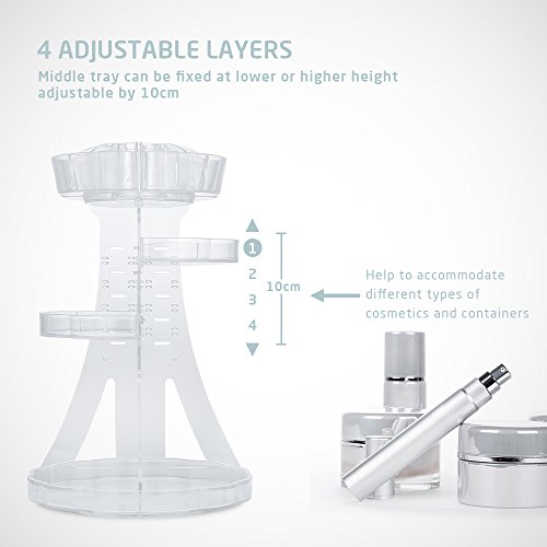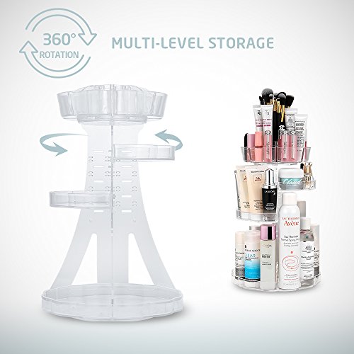 Accommodates Everything This makeup organizer provides a variety of storage cabinets for your beauty products. The height of the middle tray can be adjusted to accommodate cosmetics of all shapes and sizes. A uniquely designed round tray includes 18 well-sized compartments to store your cosmetics and accessories including lipsticks, lip gels, nail polish, makeup brushes, cheek color, eyebrow pencils, foundation sticks, beauty gadgets, necklaces, rings and more. With its steady 360 degree rotating base, you can instantly get access to all of your cosmetics!