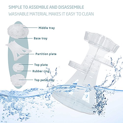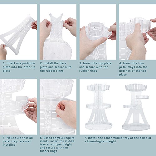 Easy Installation Guide 1. Insert one partition plate into the other. 2. Install the base plate and secure with rubber rings. 3. Insert the top plate and secure with rubber rings. 4. Insert the four petal trays into the notches of the top plate and secure. 5. Customizethe height of middle tray and secure with rubber rings. 6. Install the other middle tray at desired height.