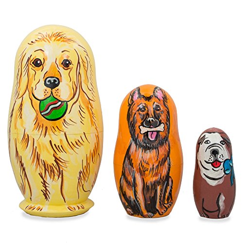 -. Title : 4.25" Set of 3 Dogs- Golden Retriever, German Shepard, Bulldog Wooden Nesting Dolls