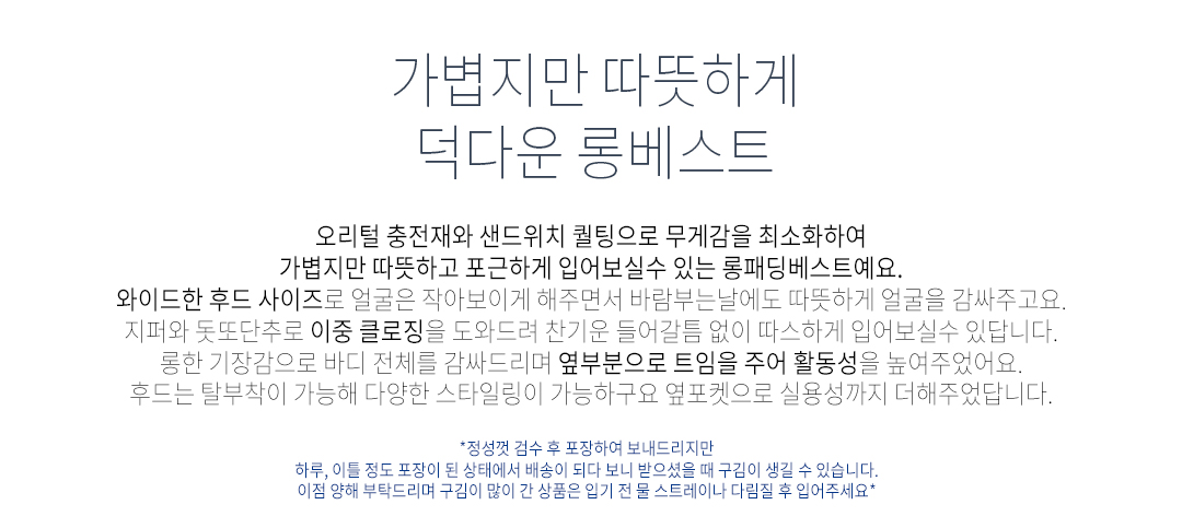 겉감폴리(polyester/)100%안감폴리(polyester/)100%충전재오리솜털(duckdownyhair/)50%+솜(cottonwool/)50%