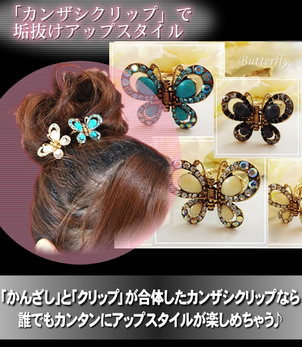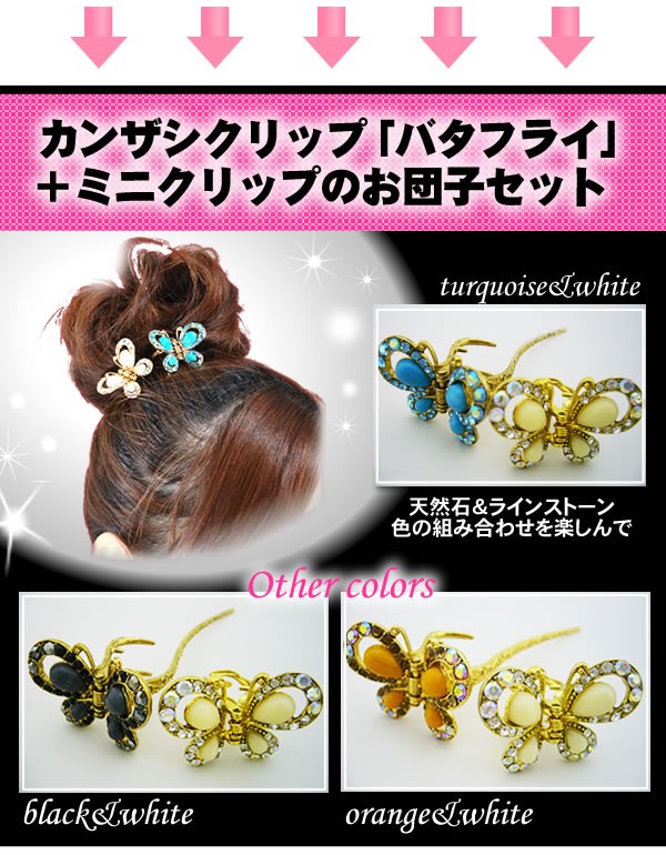 かんざしとクリップが一体になったカンザシクリップ。おだんごの根元に差して挟む。これだけでホールド力がアップしてスタイル長持ち。デザインはバタフライとフラワーの2種類。特別な日じゃなくても、サラリとアップスタイルができるワンランク上の女性に♪ サイズ/カンザシクリップ:約4.1cm×3.2cm×10.0cmミニクリップ:約3.3cm×4.1cm×3.0cm重量/カンザシクリップ:20g ミニクリップ:12g 素材・材質/クリップ部:アルミ(メッキ仕上げ) 蝶部分:天然石、ラインストーン セット内容/カンザシクリップ×1、ミニクリップ×1 原産国/韓国 ※サプライヤー直送品 ご注文後、当日~1営業日後の出荷となります【商品名】ラクラクお団子セット「バタフライ」 オレンジ&ホワイト