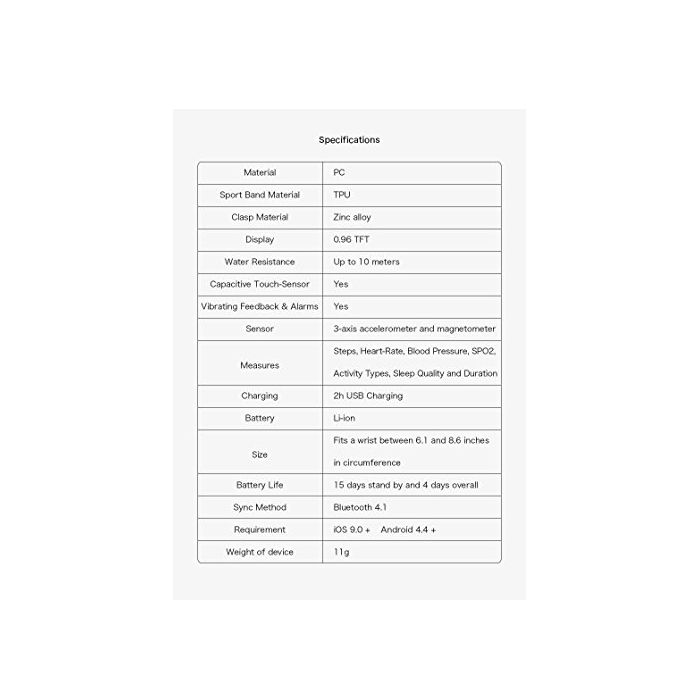 기능:동태 모니터링수를 포함하는 마음박,혈압을 감시하고, 운동을 감시하고, 수면의 감시,날씨 메세지 보내고, 착신,스마트 자명종,혈중 산소 모니터링 보고,공기의 품질,길이거는 주의하고, 문자판의 선택,사진의 제어,음악 제어.