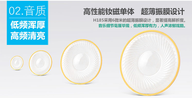 H185 also uses a hidden air vent design similar to the subwoofer speakersinverted tube it can effectively expand the frequency in the small cavitysurging this surging power but also makes the sound more levels and tension.Open structure and special guide hole design let H185 low-frequencypowerful, if the rich full high ductility and excellent.