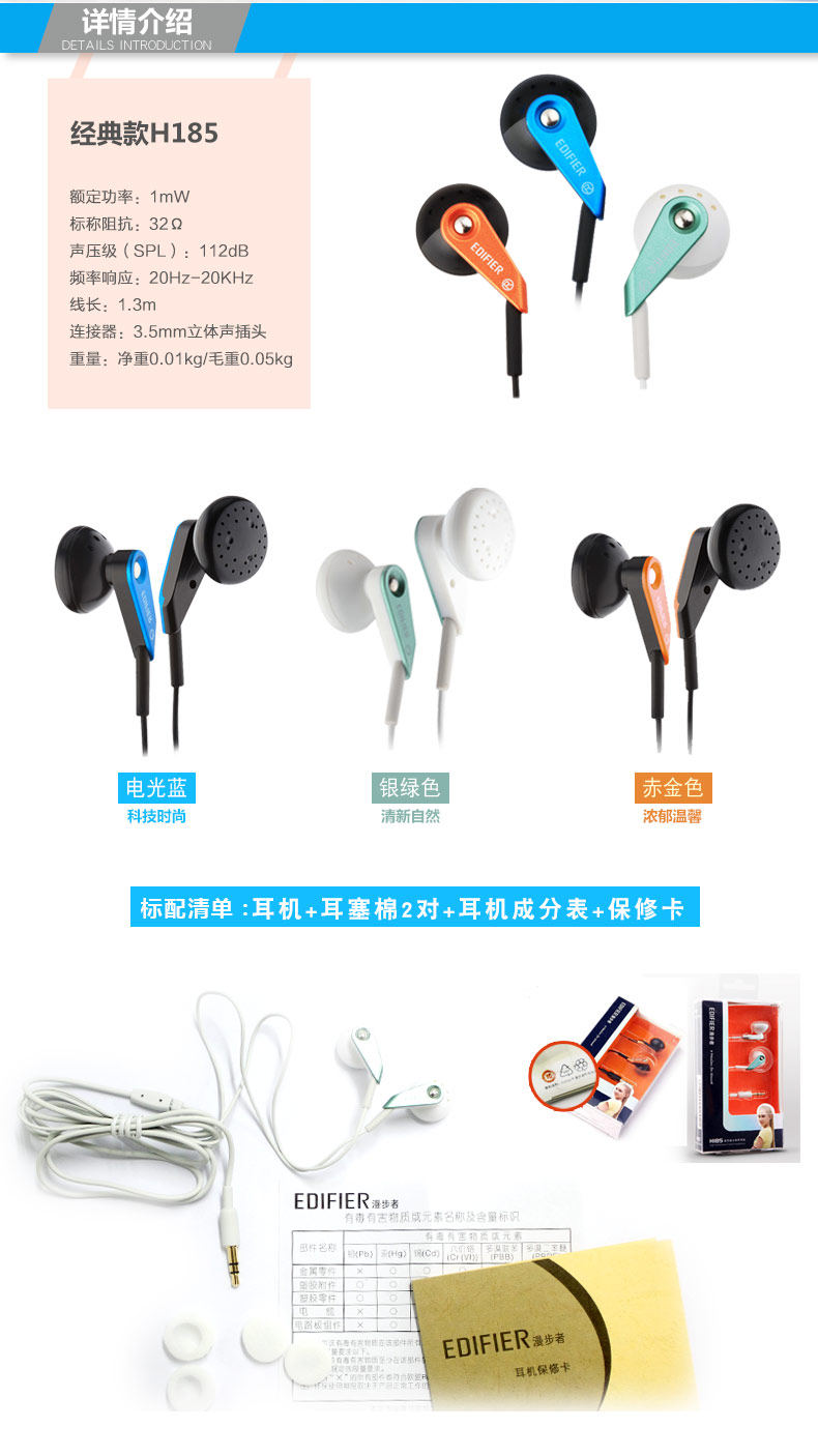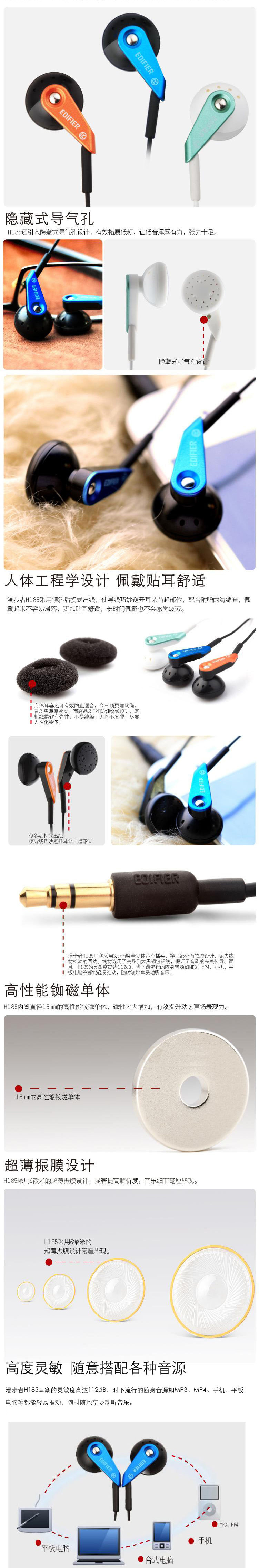 Edifier H185 earplugs with 3.5mm gold-plated stereo mini plug interface partsoft design from the wire loose distress. Wire selection of high-quality blackcopper clad aluminum, ensures the perfect transmission quality. Moreover, the sensitivity of H185 up to 112dB the most popular portable source such as MP3 MP4 mobile phone tablet computer can easily push whenever and wherever possible to enjoy beautiful music.