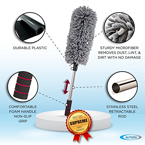- QUALITY MATERIALS USED: Measuring twenty-one by seven by almost four inches, the large Z&O CAR AND HOME DUSTER has a stainless steel shaft that expands to X inches long that includes the X inch long brush and a rubberized handle; the smaller duster measures X inches long, X inches wide, and X inches tall with a sturdy plastic black handle; with a see-through vinyl case with red inserts and a zipper, the storage case measures X by X by X inches;