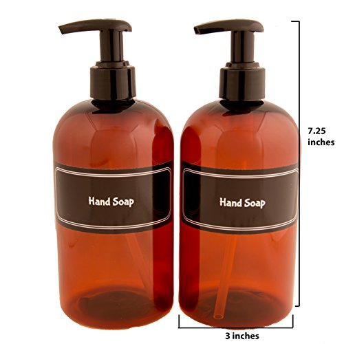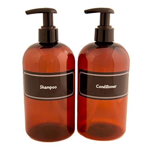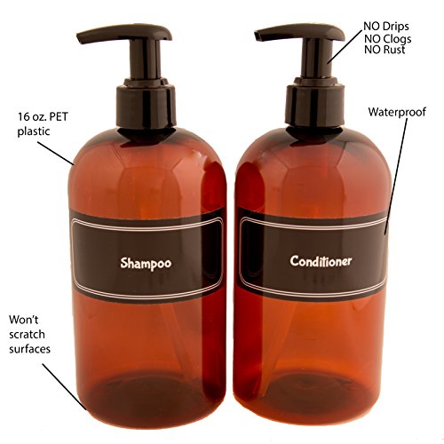 16 oz. (480 ml), AMBER PET PLASTIC BOTTLES WITH PRE-APPLIED WATERPROOF LABELS - Perfect size to beautify 1 entire standard bottle or for containing your bulk shampoo and conditioner! This bottle takes up a minimum amount of space on your shelf while reducing the number of times you'll be refilling. You don't even need to pick it up to use it, just place your hand under the pump and push down with your thumb or use the other hand to push the pump. So easy!