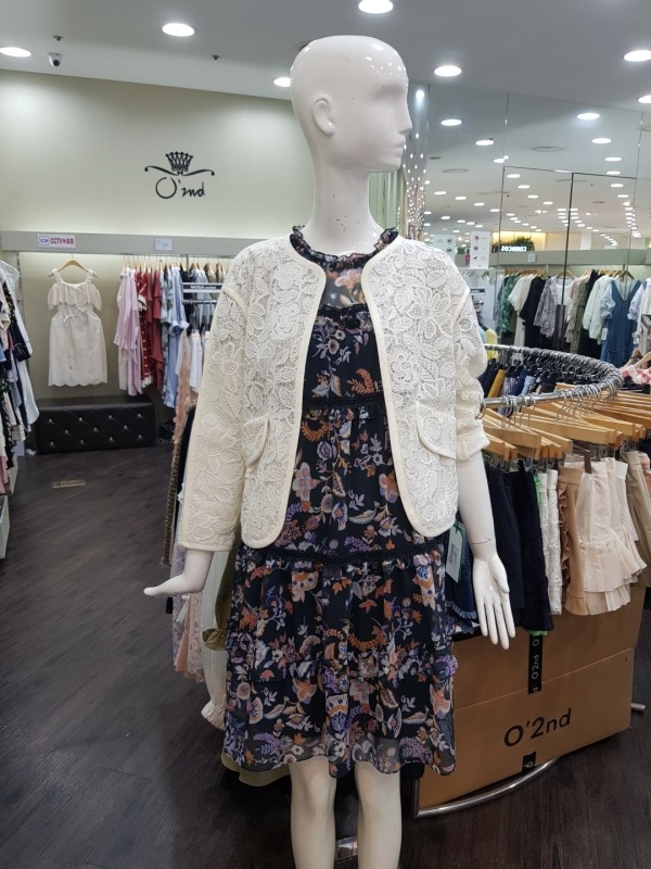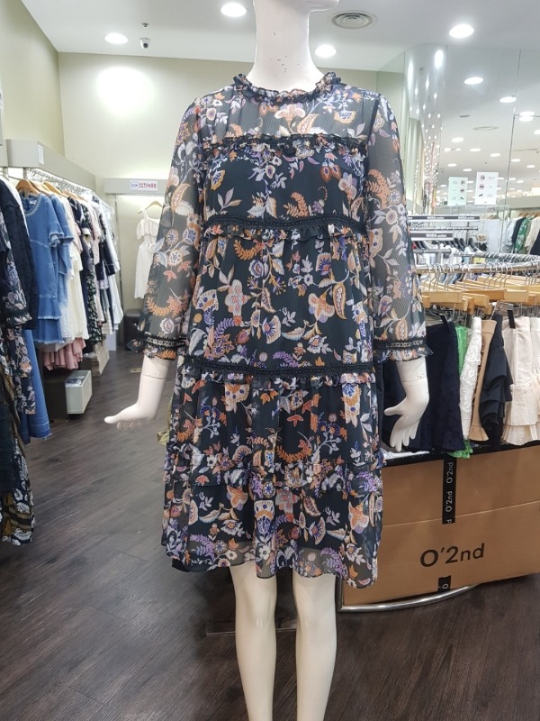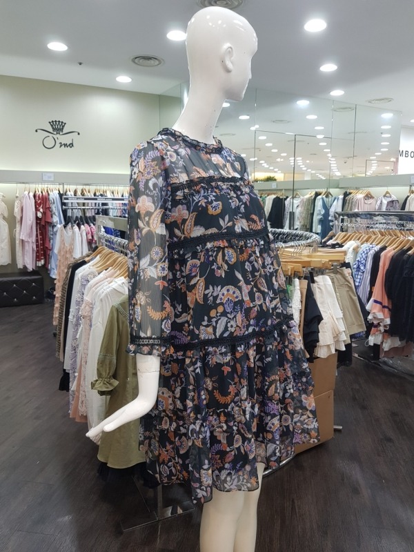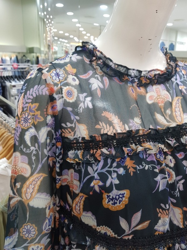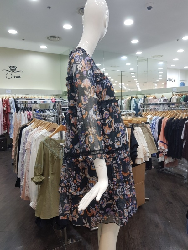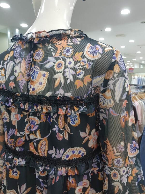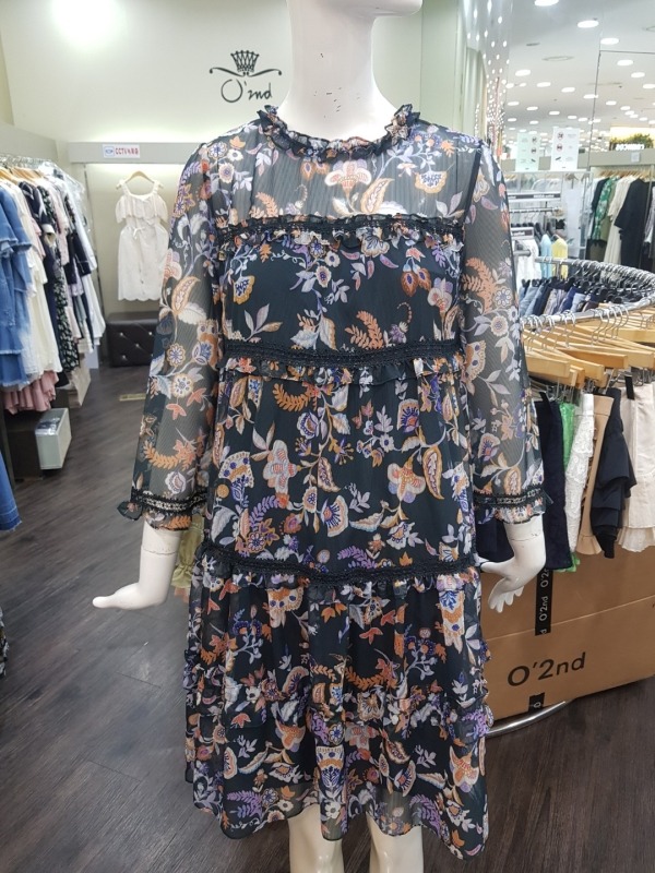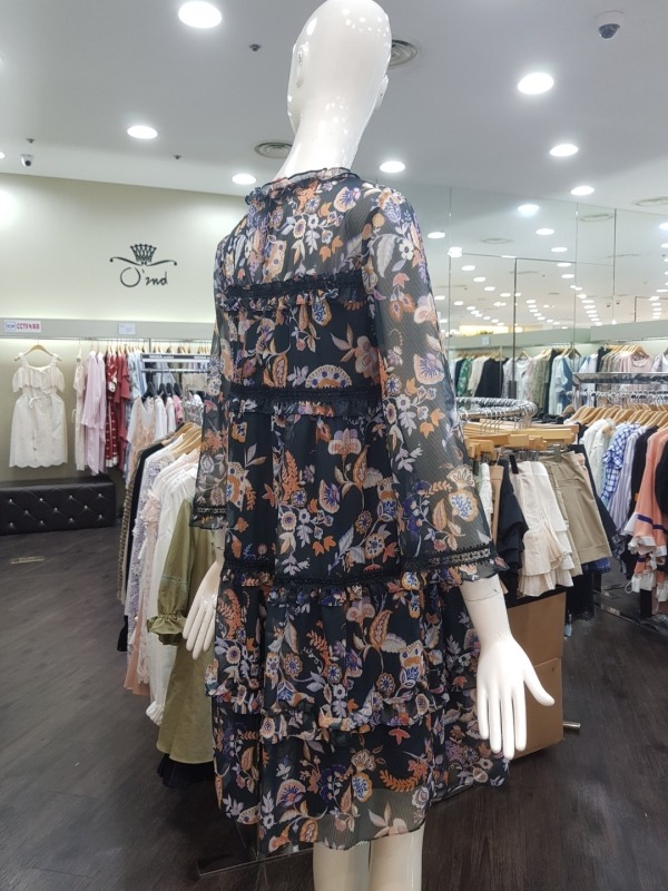 화려한 꽃 패턴이 드러간 A라인 원피스입니다.소매와 어깨상체쪽은 살짝 비침이 있는 시스루 스타일의 원피스입니다.