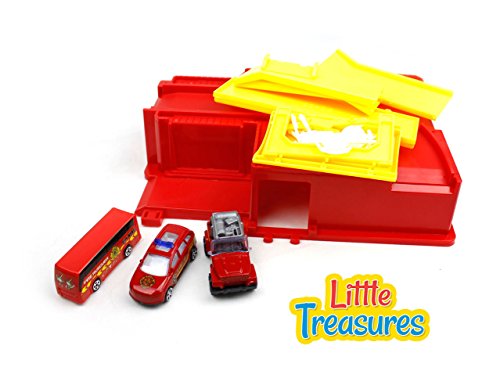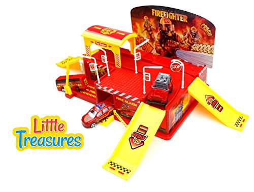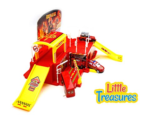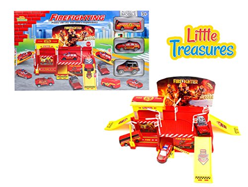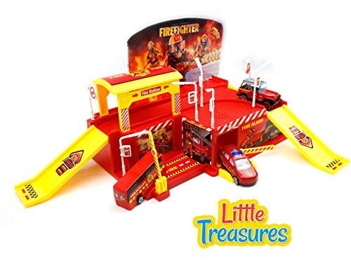 Fire-fighting, protect the city, everyone's responsibility - features a fire station with 3 sleek vehicles a bus, police chief car and rescue jeep