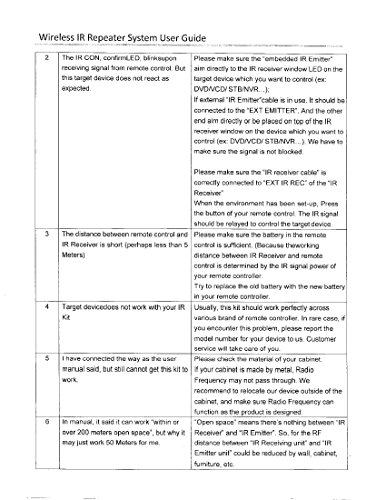 Studio : HdtvHookup Publisher : HdtvHookup Binding : Electronics Product Description Do you want to control Audio and Video Devices that are located in another room? Are you tired of leaving cabinets open so your remote can operate your devices? Why try to hide an old large antiquated wireless design behind your ultra-thin TV. Or worse having it out near your tv for all of your friends to see. Most are unsightly and not very wife friendly. Don't let the small size fool you. This has taken a long time to develop in Taiwan in the high tech area. You can control devices up to 600 feet away. This device even covers a larger frequency range than many of the wired devices today. Our device covers 20 to 60 KHz for today's demanding electronics. (Sorry it is still not going to work for U-verse) How do we do it? We use the digital 915 MHz RF technology with frequency hopping to minimize RF interference as compared to others using the old 400 Frequency bands that are very noisy and short range. Our devices are easy to use and to easy to install. The receiver and transmitter have a few options for easy installation. You can set the Transmitter out near the TV and the built in IR window on it will pick up the signal from your remote and send the command to the Wireless IR Receiver that will control your devices. This is how all wireless units work today. However not everyone wants something sitting out. Another option for the transmitter is we have included a very small wired IR Receiver pickup that allows you to hide the Transmitter behind your TV. So all you have to do is put the small pickup where it is in the line of sight to your remote. Then it plugs into your transmitter and will transmit the signal to the receiver You can set the Wireless Receiver out in the open on top of your devices you are trying to control. When it gets the signal from the Transmitter then it has a built in IR blaster that then floods the area with IR. Advanced Full Band IR frequency is 20~60 Khz. for cover more IR devices. 0