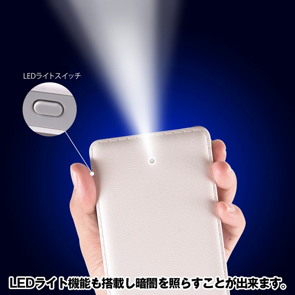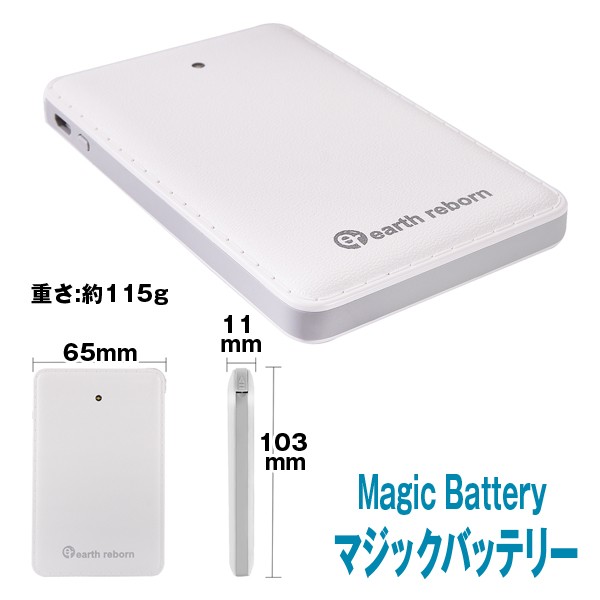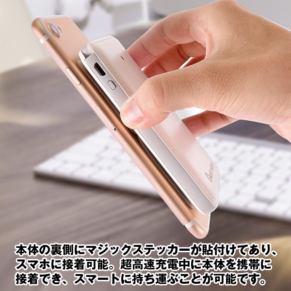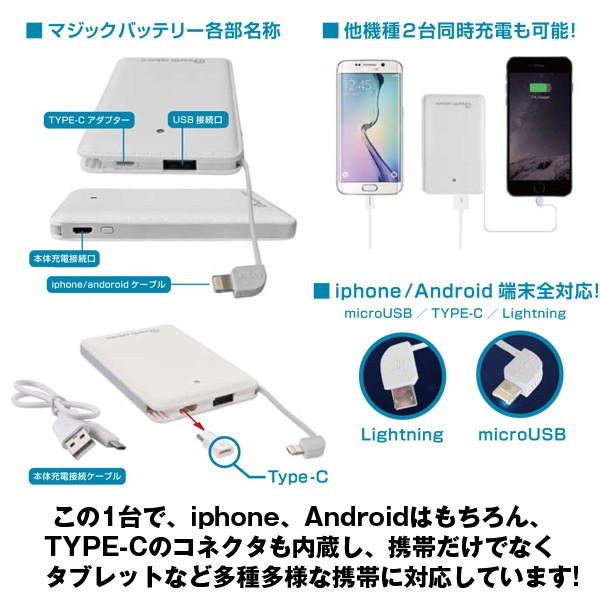 特殊ステッカー付きだからスマホの裏に装着でき充電しながら使用可!!マジックバッテリーは、超薄型モバイルバッテリー! 超高速充電中に本体を携帯に接着でき、スマートに運ぶことが可能です。 この1台で、iphone、Androidはもちろん、TYPE-Cのコネクタも内蔵し、携帯だけでなくタブレットなど多種多様な携帯に対応しています! このマジックバッテリーは、本体の裏側にマジックステッカーが貼付けてあり、スマホに接着可能となっています。 使わない場合はシートカバーをすればOK。 このステッカーは何度も取り外しが可能で、粘着力が弱まったらステッカーだけを剥がし、水洗いをすれば元の粘着力が復活します。 さらに、LEDライト機能も搭載し暗闇を照らすことが出来ます。また、このライト部分はインジケーターにもなっており、点滅の回数で充電量や残量を確認することもできます。 【充電残量の確認】点滅1回:25%点滅2回:50%点滅3回:75% 点滅4回:100%■商品サイズ:縦103×横65×厚み11mm