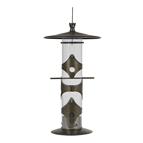 -. Feature : Allows only Goldfinches to feed upside down / Holds up to 3 lbs. of thistle seed or finch mix / Clear plastic tube lets you monitor quantity / Features 6 feeding stations to handle many birds / Attractive metal top, port bands and perches
