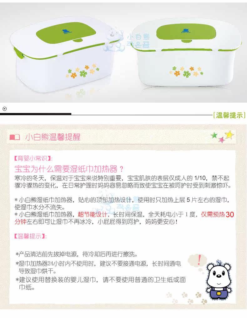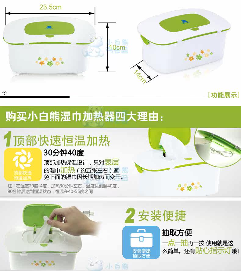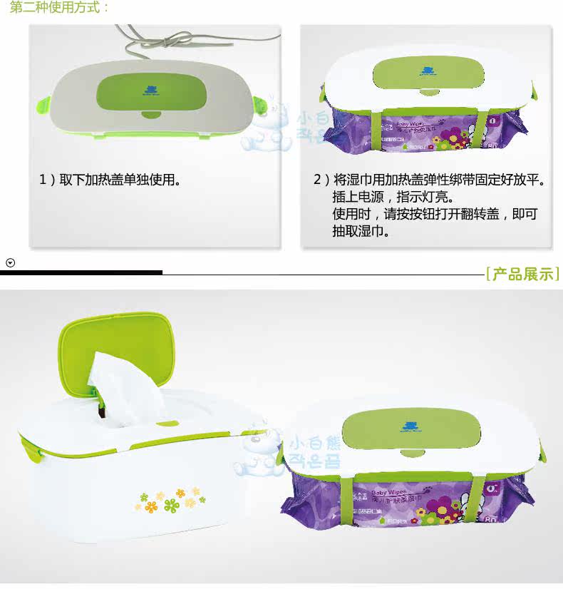 1. Wet the top heating and insulation, so that the baby's skin feeling comfortable and warm. 2. rapid heating, the top heating for about 30 minutes to reach the appropriate temperature. 3. You can use a combination of home, can cover the heating alone, modeling light, varied. 4. Automatic rebound strap design, let wipes can automatically maintain a constant temperature heating surface, easy to install, easy to extract. 5. Only 8W super-power design, and affordable. |