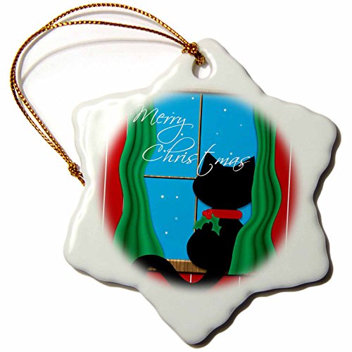 3dRose orn_155257_1 Merry Christmas Cute Black Cat in Snowy Window Porcelain Snowflake Ornament, 3-Inch