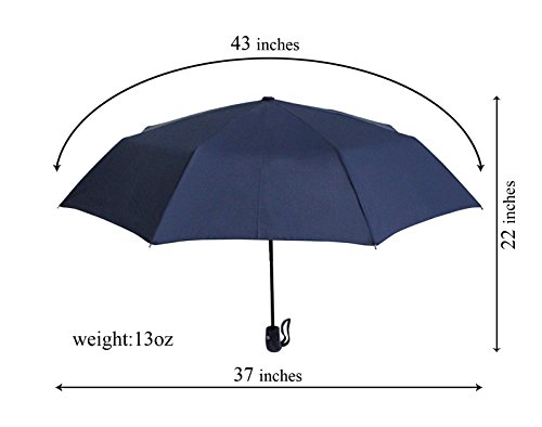 Product Description Auto Open/Close Push Button Thoughtfully designed to keep you dry in any situation - getting in/out of car or having your hands full - the umbrella's canopy automatically opens and closes in less than a second at the simple push of a button. After the canopy collapses, manually push the shaft down into locked position and the auto open mechanism is ready to be used again. Compact SizeProvides ample coverage opening up to 43" arc and 37" diameter, perfect for 1 person and covers 2 marginally. When closed, it folds into a conveniently compact size, measuring just 12" long and weighing at 13oz, fitting easily and neatly in a backpack, case or tote bag. Its compact size and light weight makes it the perfect choice for any busy traveler or those ever-ready. Own it in multiple colors - stash one each in your daily bag, by the door, in your office desk drawer, and in the storage pocket of every door of your car! Keeping DryMade from high-density carom cloth, the canopy is water resistant and provides UV protection. Even though many brands claim that their umbrellas are 'windproof', it is hard to remain sheltered without risking damage to your umbrella in extreme weather. While our umbrellas can endure strong winds - its strengthened black steel shaft and ribs (8-rib) are constructed to ensure a strong, flexible and wind-resistant product and the reinforced ribs make it tougher for them to be turned inside-out in rough storms - they are specially designed to flip inside-out in dangerous winds to prevent a Mary Poppins situation and will revert without damage with a simple touch of the auto close button. ErgonomicComes equipped with a palm-sized ergonomic curve-shaped handle for easy and comfortable hold in one hand, ensuring a secure grip without fear of slippage in the rain. Also includes a sleek easy slip-on storage sleeve to keep the umbrella neatly stored and the wrist strap allows for convenient hands free carrying. 0 |