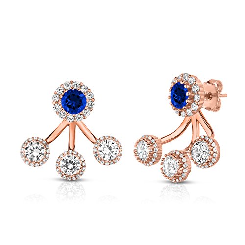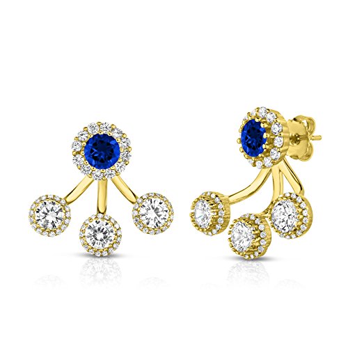 Our front to back 2 in 1 earring set has an edgy and modern look and made from sterling silver with a high shine finish. This set can be either worn together or separately; a Created Sapphire stud enhanced by a halo and a row of 3 lustrous cubic zirconia stones, also enhanced by a halo, along your ear lobe. This design gives a modern vibe to formal stud earrings. Be prepared to amaze and impress with this new twist.Feature