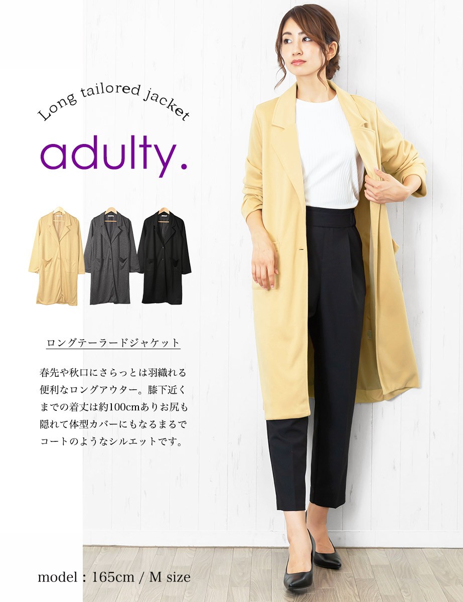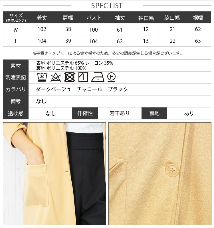 L:着丈 104cm 肩幅 39cm バスト 104cm 袖丈 62cm 袖口幅 13cm 脇口幅 22cm 裾幅 63cm
