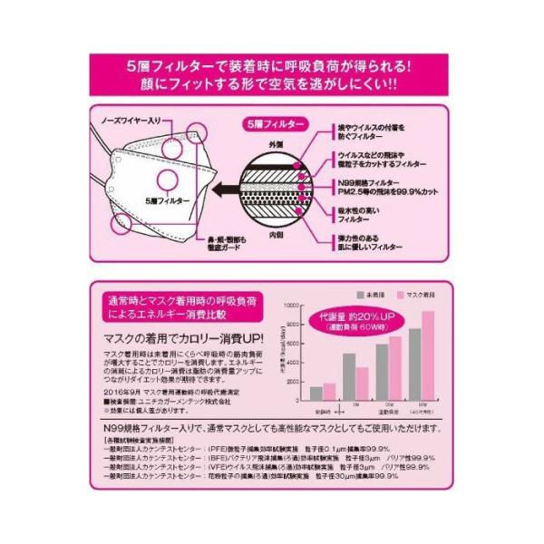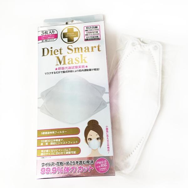 つけてるだけのマスクダイエット!マスクをするだけで腹式呼吸を促し、筋肉運動量の増加をサポートする「ダイエット スマート マスク」特殊フィルターを使った5層構造で、顔にフィットするので空気を逃がしにくい!立体構造で小顔見えも!装着時に呼吸負荷をかけることができ、腹式呼吸をすることで筋肉運動量を増やし、カロリー消費に繋げていくことができる画期的なマスクです。また、ダイエット効果だけでなく、花粉やウイルス、ホコリはもちろん、PM2.5を防ぐフィルターを使用しているので、通常のマスクとしてもお使いいただけます。■商品名 ダイエットスマートマスク 3個セット■仕様  1箱3枚入り×3箱 計9枚     使い捨てタイプ・レギュラーサイズゴム紐調節可能■色   ホワイト■サイズ (約)W20cm × H16cm■材質  本体:N99規格フィルター、不織布、ポリエステル     耳掛け部:ポリエステル     ノーズワイヤー部:PE※着用することで呼吸に負荷を与える構造を持ったマスクです。呼吸器・循環器等の疾病で医療機関を受診している方やお子様は使用しないでください。
