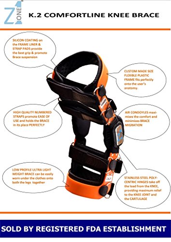 -. Feature : CHOOSING THE CORRECT SIZE: Please see photograph #2 for the measurement instructions. After taking the measurements of thigh and calf circumference, know your perfect brace size (from S1 to S23) from the size chart in photograph #3 and select the same from the dropdown / This brace is universal & single one can be used on both legs.K2 ComfortLine Knee Brace is a light weight everyday use high performance Knee Brace. It is a truly custom made knee brace manufactured as per the measurements of the user. It is suitable for ligament injuries (such as ACL, PCL, MCL), Sport Injuries, Mild Osteoarthritis (OA) as well as for prevention of the knee joint from degeneration. MANUFACTURED BY A FDA REGISTERED ESTABLISHMENT. / High strength Stainless Steel polycentric hinges transfer the maximum body weight from Thigh to Calf without exerting pressure on the Knee Joint. Thus, making it a perfect off-loader knee brace. / Silicon coated neoprene frame liners & foam strap pads provide the best grip & promote brace suspension. Advanced flexible plastic thigh & calf frame confirms to body anatomy and provide the best grip. / Air Condoyles on both brace joints provide relief to the sensitive knee joint & ligaments. It maximizes comfort & minimizes brace migration. The brace construction is Low profile & Lightweight, which make it extremely easy to use with daily activities.