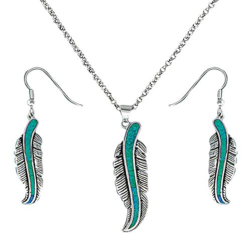 The Storyteller collection jewelry set features a large silver feather gracefully curved, with softly antiqued barbs and a striking opalescent turquoise shaft. The large feather earrings dangle from French hooks, and the matching necklace pendant hangs from a polished silver bale on a 19 1/2 inch chain.Feature