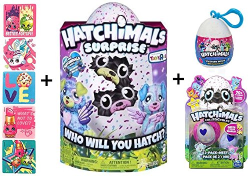 -. Binding : Toy -. Brand : Hatchimals -. Feature : Bundle includes (1) Hatchimals Surprise Twins Puppadee (1) BONUS CollEGGtible 2 Pack with Nest, (1) Mystery Mini Plush Clip-on and (5) very cool Shopkins Glitter Sticker- 2.5" each! / Hatchimals Surprise has arrived! Inside each magical speckled egg are Hatchimals twins! Who will you hatch? / Hold and rub your Hatchimals Surprise egg and you will hear adorable sounds and may even see a set of eyes inside! Love and care for your egg to help your twins hatch! / Hatchimals Surprise are made for kids aged 5+. 2 AA batteries and 3 LR44 button cells batteries required (included). / This Hatchimals Puppadee Surprise Twins bundle in the perfect gift for any Hatchimals super fan! -. Label : Spin Master -. Manufacturer : Spin Master -. MPN : 534534 -. PartNumber : 534534 -. ProductGroup : Toy -. ProductTypeName : TOYS_AND_GAMES -. Publisher : Spin Master -. Studio : Spin Master -. Title : Hatchimals Surprise Twins Puppadee + BONUS CollEGGtible 2 Pack with Nest + Mystery Mini Plush Clip-on + 5 Shopkins Glitter Stickers!