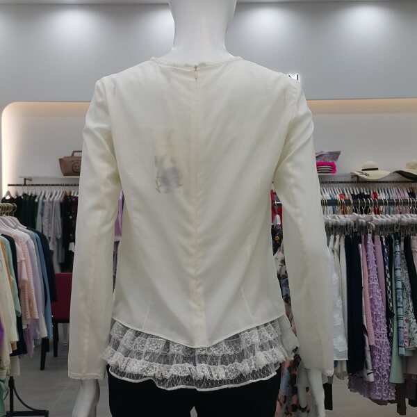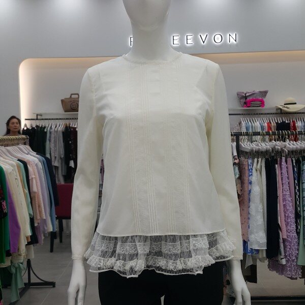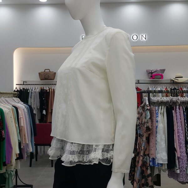 밑단에 캉캉 프릴이 달린 슬립과 세트로 연출하는 블라우스로 앞판의 자수 디테일이 고급스러움.
