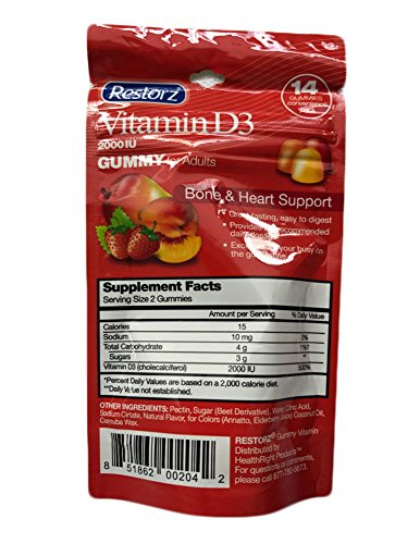 -. Feature : 3 packs of Restorz Vitamin D3 Gummies Dietary Supplement / 14 gummies per package (42 pieces total) / 2000 IU per gummy (the recommended daily dosage) / Bone & Heart Support / Peach, Mango, and Strawberry Flavored. Great tasting, easy to digest.