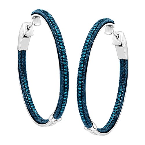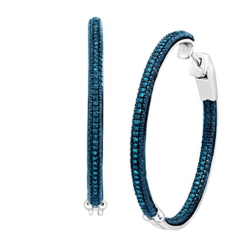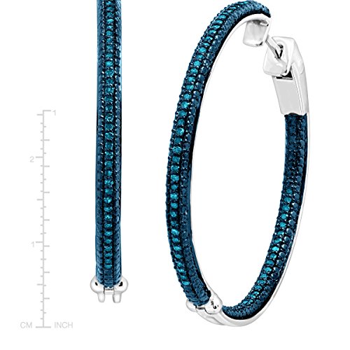 Why settle for plain hoop earrings when you can get this futuristic set? Shimmering round-cut blue diamonds totaling 1/2 ct, decorate both faces for double the sparkle, while the sterling silver metal features a plating of blue and white rhodium for double the shine! Earrings rock an unique click-top design for the ultimate fastening security and a bottom hinge for easy insertion and removal. Pieces measure 1 1/2 inches in diameter. Colored diamonds may have been treated or enhanced by heating or irradiation.Feature
