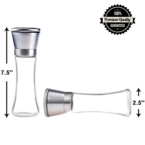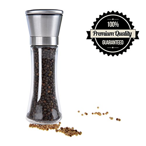 PREMIUM Salt or Pepper Grinder Brushed Stainless Steel Professional 5 Grade Precision Ceramic Rotor With Clear 7.5Inch Tall Glass Bottle 6 Ounce Volume