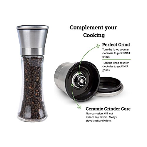 - High-Quality Made and Double Layer Package - Made with food-grade stainless steel, these salt and pepper mills can be used for standard spices Sturdy glass can withstand the impact ,not afraid fall to the ground accidentally anymore.