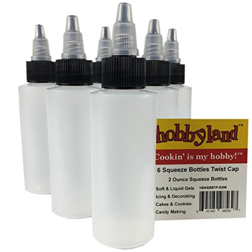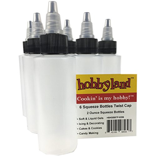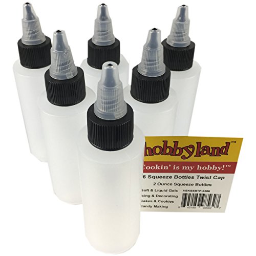 Studio : Hobbyland Publisher : Hobbyland Product Description For decorating, icing and glazing cakes, candies, chocolates, cookies and cupcakes. Also for bbq, barbecue, condiments, dressings, oils and sauces in cooking and food preparation. Features: 2 oz, 6 Pack Squeezable Bottles FDA Safe BPA Free Known as: Squeeze Bottles Squeeze Bottle with Twist Cap Red Cap Squeeze Bottles Icing Squeeze Bottles Decorating Squeeze Bottles Plastic Ketchup Squeeze Bottles Condiment Squeeze Bottles OIl Squeeze Bottles Semi-Clear Squeeze Bottles Cookie Decorating Squeeze Bottles Frosting Squeeze Bottles Pancake Squeeze Bottles Craft Glue Squeeze Bottles