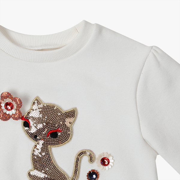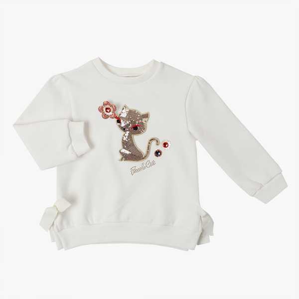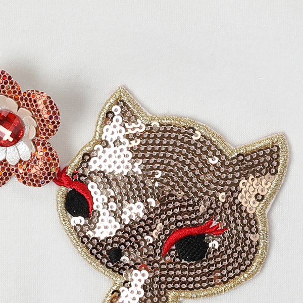 상품설명 아이보리컬러의 편안하게 입을수 있는 롱맨투맨 티셔츠 입니다. 가슴에 골드 고양이 포인트와 입체꽃들이 블링블링하며, 측면에 니트리본이 러블리함을 더했습니다. 네이비 쟈가드 치랭스 또는 네이비배색레깅스, 네이비 레이어드 레깅스등과 코디하시기 좋습니다.