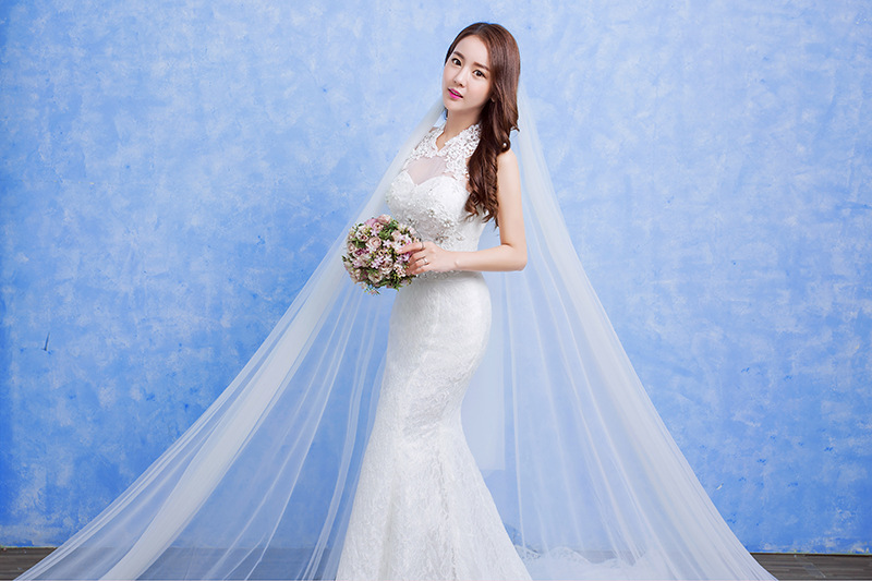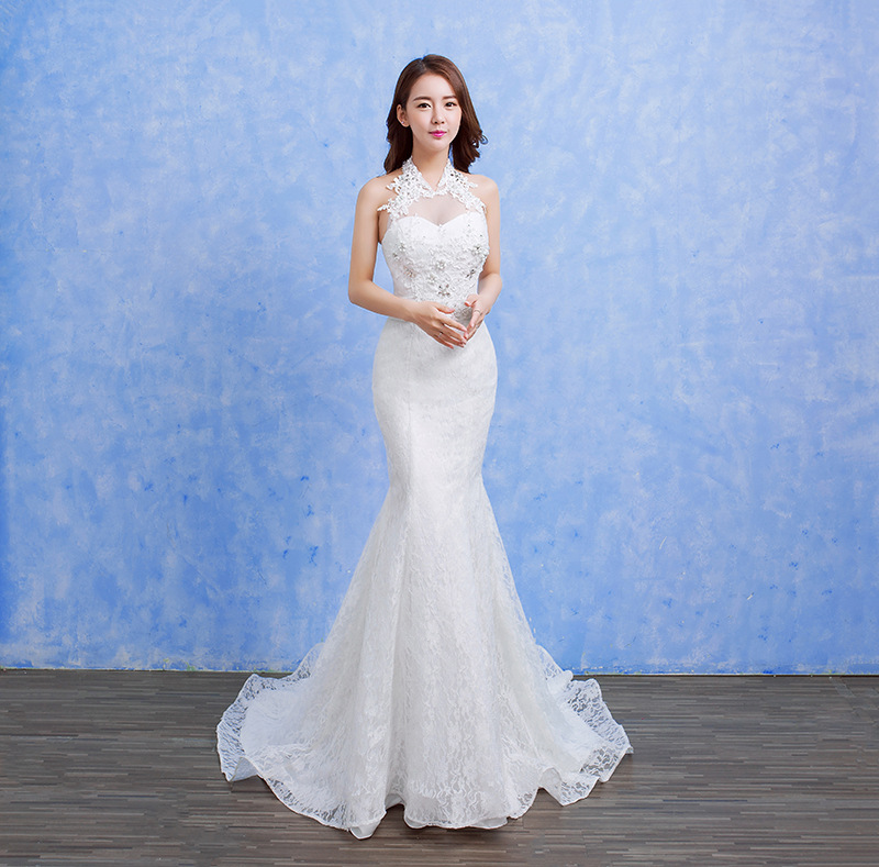 - Leondo ivory long train dress lace halter beading bridaldresses Real Image