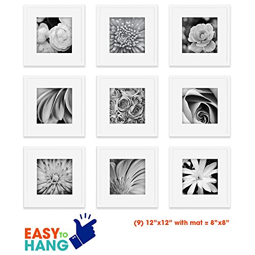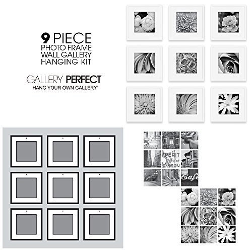 Display your photos or art in style with this 9 piece white frame kit. This kit will allow you to configure your own in-home art gallery in whatever design suits your space best. Kit includes nine 12"x12" frames with 8"x8" white mats. They all fit within a minimum 5-foot area. A template of possible layouts is included for easy setup and creative inspiration. Place your own photos or art in them, or style with the included usable art.Feature
